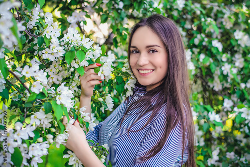Beautiful girl near blooming apple trees in spring