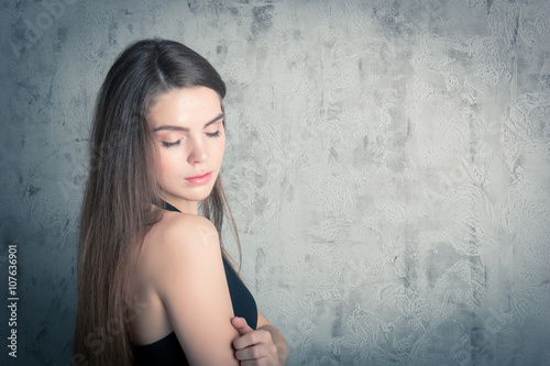 beautiful girl posing in a black evening dress. toned portrait in the studio