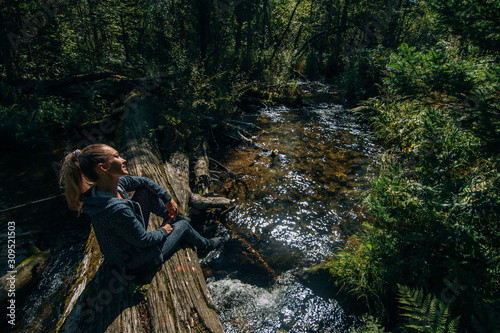 Beautiful girl sits on log and chilling after travel. Woman traveler in summer passes on wooden bridge in background of forest. Bridged lies on the river. Model of caucasian is chill and happy.