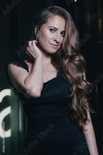 Beautiful girl standing near shopwindow on the night city street. Fashion style portrait of young pretty beautiful woman with long dark curly hair