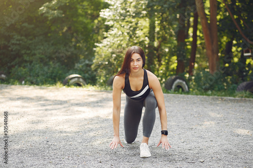 Beautiful girl training. Sports girl in a sportswear. Brunette in a black top