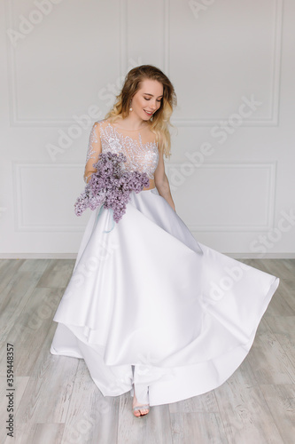 Beautiful girl woman bride in a delightful wedding dress with a bouquet of flowers dancing in front of a mirror portrait of a blonde with blue eyes holding