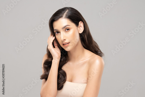 Beautiful Glamour indian woman touch cheek smile with clean and fresh skin Happiness and cheerful with positive emotional,isolated on grey background,Beauty Cosmetics and spa Facial treatment Concept