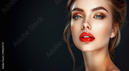 Beautiful glamour woman with makeup and red lips on black background.Space for text.AI Generative.
