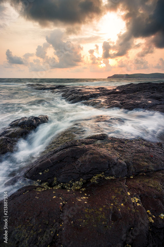 sea, sunset, ocean, beach, sky, water, coast, landscape, nature, sunrise, rock, blue, wave, sun, rock, cloud, wave, seascape, stone, summer, bay, cloud, horizon, coastline, shore, long exposure, travel