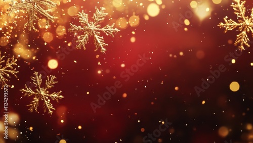 Beautiful golden snowflakes and shimmering bokeh lights on a festive red background creating a magical winter wonderland atmosphere for holiday celebrations