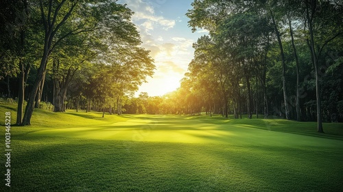 Beautiful golf course with emerald green grass, framed by dense woods, offering a calm and scenic sports environment.