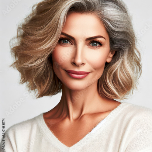 woman, health, gorgeous, mature, middle, honed, soft, make-up, beautiful woman, female model, copy space, elderly, elegant, modern, mid-age, smiling face, smooth skin, age, grey, bodycare, hair, healthy, nourishment, happy
