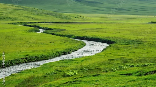 Beautiful Grassland River and Green Grassland Background: A Serene Natural Scene. Admire the Peace and Beauty