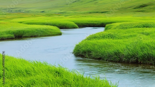 Beautiful Grassland River and Green Grassland Background: A Serene Natural Scene. Admire the Peace and Beauty
