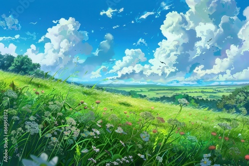 Beautiful green field with wildflowers under a bright blue sky with fluffy clouds. Peaceful summer meadow landscape scenery, concept of nature, travel, and serenity.