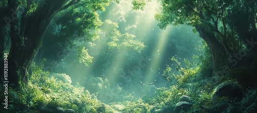 Beautiful Green Forest with Sun Rays and Light Beams. AI generated illustration