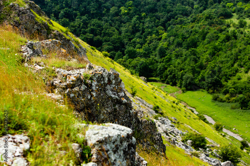 Beautiful green landscapes with hills, forest and rocks in Moldova. Eco tourism without people.