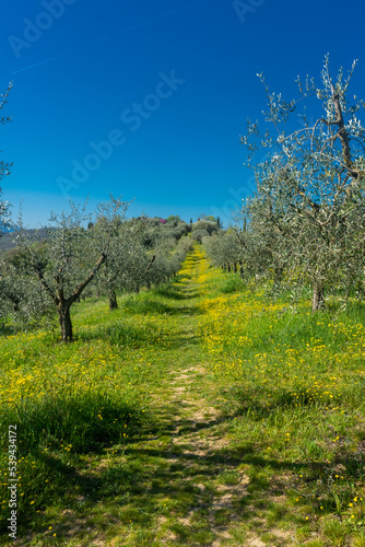 Beautiful green meadow full of colorful flowers at spring, Italy