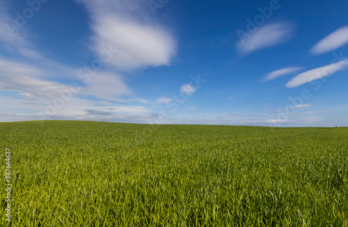 green, wheat, germinating, beautiful, sprout, sunny, weather, field, against, blue, sky, farm, cloud, nature, spring, agriculture, landscape, plant, day, seed, bright, growth, agricultural, cereal, young, summer, harvest, meadow, crop, cereal, rural, nobody, grain, country, barley, sunlight