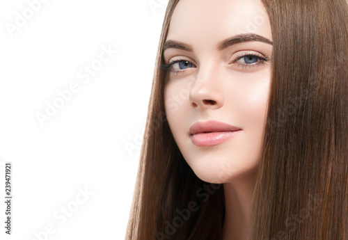 Beautiful hair smooth brunette woman beauty portrait healthy skin and haistyle