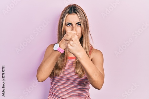 Beautiful hispanic woman wearing casual summer t shirt punching fist to fight, aggressive and angry attack, threat and violence