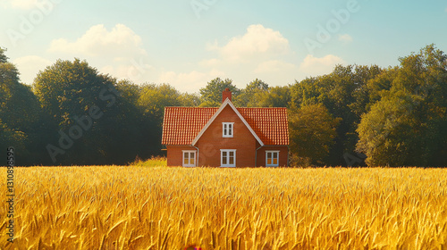 Beautiful house positioned amongst lush wheat field under a bright blue sky on a sunny day in the countryside