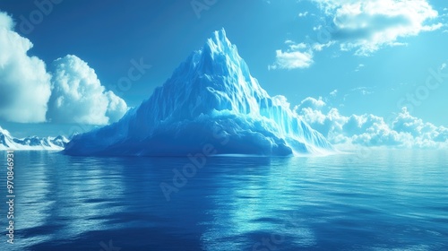 Beautiful iceberg mountain surrounded by icy waters, with vibrant blue and white tones, set against a realistic background of sea and sky