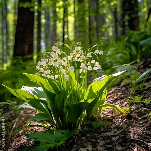 Beautiful illustration of blooming flower of lilies valley in the forest. Beautiful blooming spring white forest flowers, close up. White Lilies valley against forest.