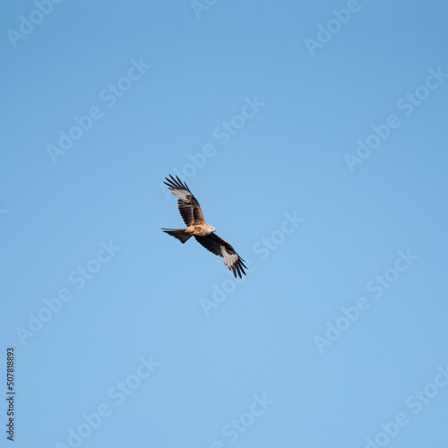 Beautiful image of Marsh Harrier Circus Aeruginosus bird of prey in flight hunting for food over wetlands landscape in Spring