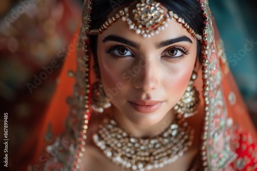 woman, bride, indian, wedding, jewellery, traditional, beautiful, elegant, adornment, ceremony, culture, festive, ornate, headpiece, gold, silver, pearl, necklace, eye, eyelash, make-up, hair, dress, saree, henna, red, orange, silk, closeup, portrait, fashion, style, celebration, love, joy, happiness, pose, model, photo, photo, art, expression, gaze, sharpened, romance, detail, beauty, heritage, attire