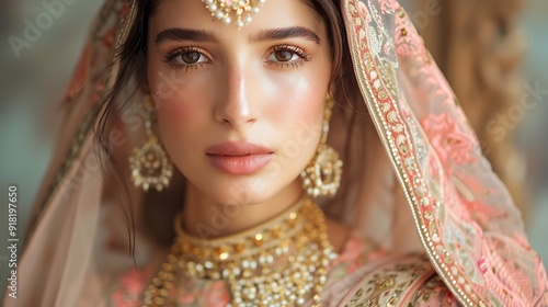 woman, beautiful, bride, indian, jewellery, wedding, traditional, bridal, eye, make-up, elegant, fashion, style, portrait, gold, headpiece, saree, veil, ornate, hair, gorgeous, feminine, dress, culture, art, sparkly, dainty, romantic, head, beauty, look, face, model, eyeshadow, sparkle, pose, earring, necklace, embroidery, pearl, fabric, design, gaze