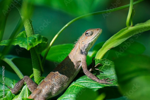 Beautiful Indian gecko inside a bush looking out , green foliage background, morning light , Kolkata, India - nature stock photograph