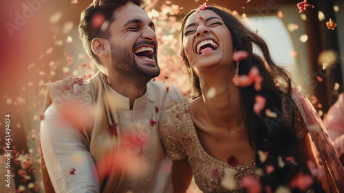 Beautiful Indian wedding couple laugh in dance, confetti falling, fancy golden tones,