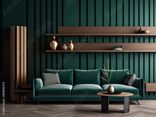 Beautiful interior design in green and turquoise tones. Generated by AI.