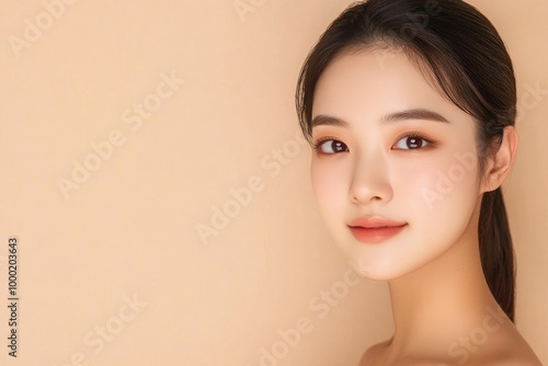 Beautiful Korean female model with clean, fresh skin on beige background, looking at camera