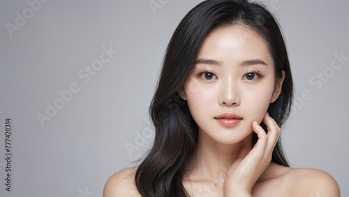 beautiful Korean girl good skin black hair white background skin care Hight detail