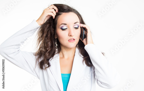 Beautiful lady in white jacket with mobile ephone isolated on white background