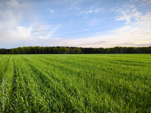 Beautiful Landscape nature background image of spring nature with surrounded by trees against a blue sky sunny day. Lush green field