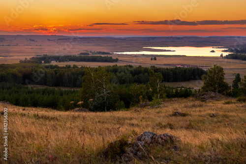 beautiful landscape on the Irandyk ridge in the Southern Urals at sunset on a summer evening