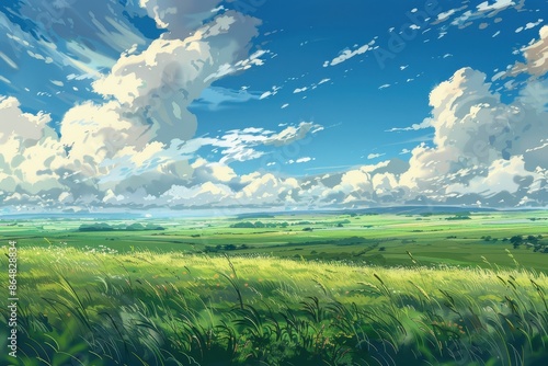 landscape, field, grass, green, blue, sky, cloud, white, fluffy, nature, outdoors, scenic, summer, meadow, horizon, painting, art, digital artwork, illustration, background, wallpaper, beautiful, peaceful, serene, tranquil, calm, relaxing, scenery, picturesque, idylli, pastoral, countryside, rural, open space, sunlight, sunshine, bright, vibrant, colourful, fresh, clean, minimalist, simple, abstract, artistic, impressionistic, realistic, dreamy