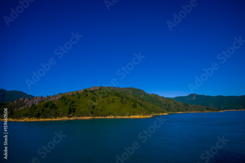 Beautiful landscape with gorgeous blue sky in a sunny day seen from ferry from north island to south island, in New Zealand