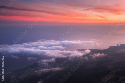 Beautiful landscape with sea, colorful sunset and low clouds. Nature background
