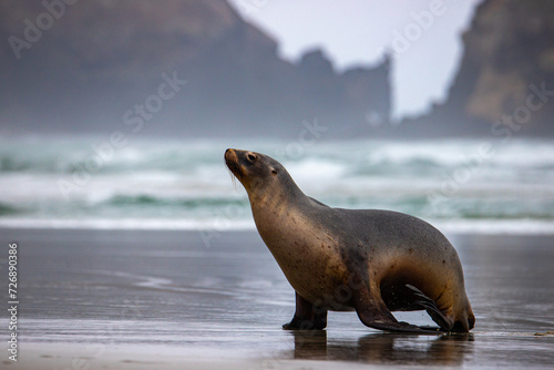 beautiful large new zealand sea lion resting on the beach in otago peninsula, new zealand; cute marine wildlife in new zealand south island
