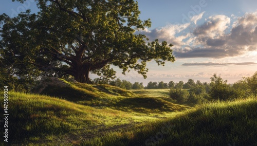 Beautiful, large oak tree in the middle of a green meadow, a landscape with beautiful trees and grass at sunrise