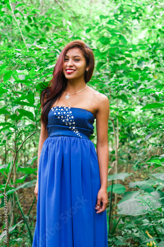 beautiful latin woman with blue dress at forest