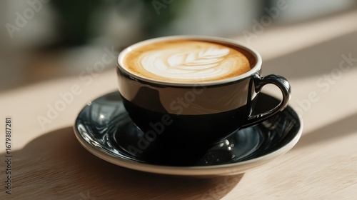 Beautiful latte coffee with detailed leaf latte art served in black ceramic cup and saucer, highlighted by warm sunlight and soft shadows on a beige surface for cozy coffee experience