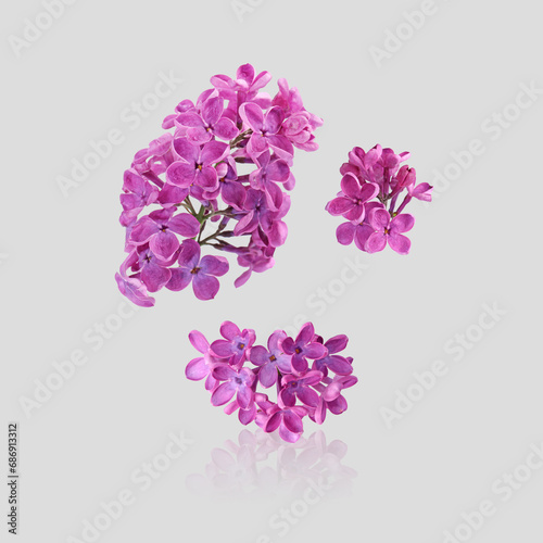 Beautiful lilac flowers falling on light grey background
