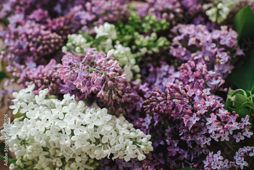 Beautiful lilac flowers on wooden background. Colorful purple and white lilac branches on rustic table. Spring countryside still life, floral image. Happy mothers day