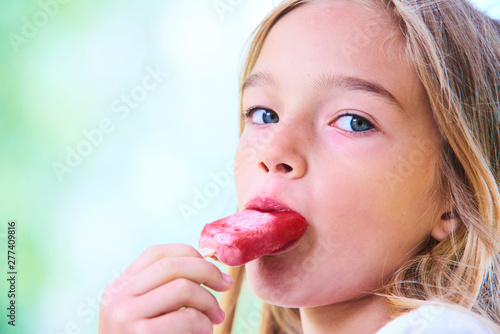 Beautiful little girl eats strawberry ice-cream in the summer. Selective focus