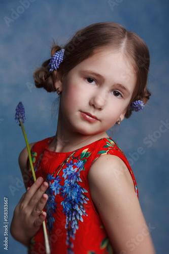 small, beautiful, girl, red, dress, studio, blue, background, youth, children, tenderness, flower, nature, woman, retro, portrait, vertical, pattern, femininity, smile, childhood, fashion, hair