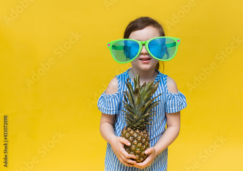 beautiful little girl in big funny glasses holds a pineapple on a yellow background with a place for text