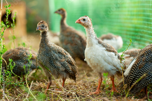 Beautiful little Guinea fowl looking at you. Breeding of Guinea fowls in the harsh Northern climate - in Russia, Moscow region. Colorful photo