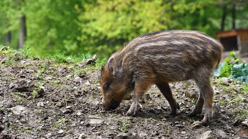 Beautiful little pig wild in nature. Wild boar. Animal in the forest