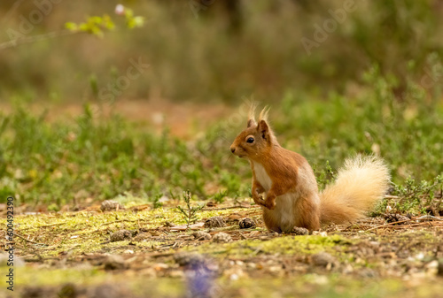 Beautiful little scottish red squirrel in the spring sunshine looking around in the woodland undergrowth
